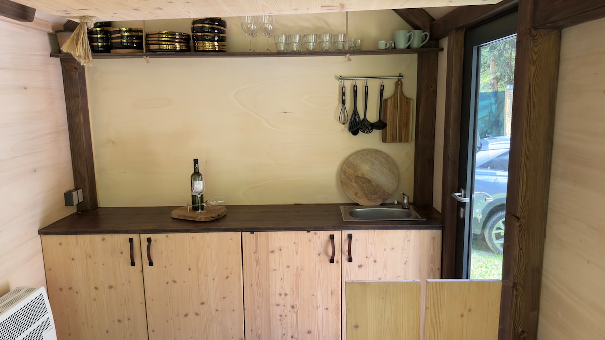 Modřínový mini domek je vybaven luxusní matrací s mušelínovým povlečením, minikuchyňkou, splachovací toaletou a repasovanou vintage vanou na nožičkách. Na terase najdete sezení s pohovkou, křeslem a houpací sítí. Grilovat můžete ve venkovní kuchyňce na elektro grilu. Kapradí je jedním ze tří minidomků v naší lesní oáze. Jsme na okraji města a přitom hned vedle lesa. O snídani je postaráno, v ledničce budou dobroty od místních pěstitelů a farem. Rádi poradíme tipy na procházky i jídlo.