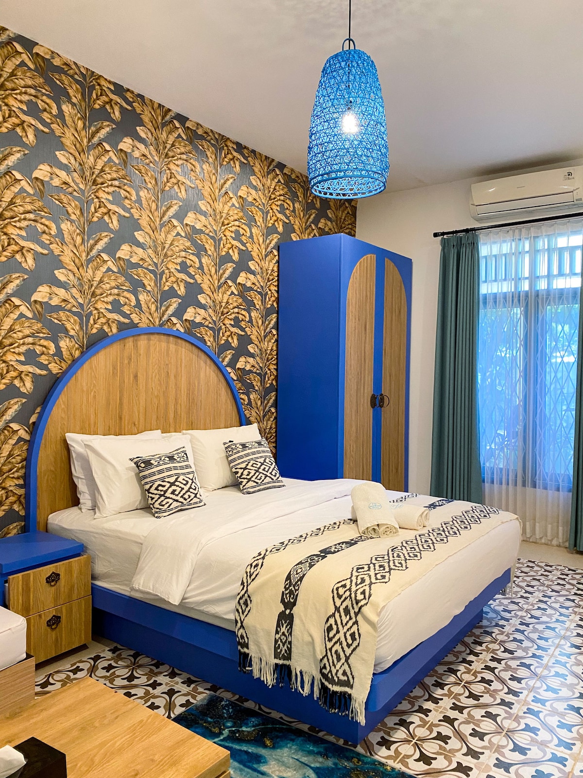 designed with a blend of modern comfort and artistic elegance. The room features a comfortable double bed with premium linens, air conditioning, and a calming color palette highlighted by unique patterned tiles and handcrafted furniture. Natural light fills the room through large windows, creating a bright and welcoming atmosphere. Guests will enjoy thoughtful details such as ample storage space, a work-friendly table, and warm ambient lighting—perfect for both relaxing and productive stays.