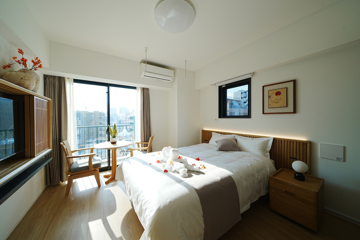203房间。押上站6分钟,近晴空塔,直达浅草、上野、银座、涩谷、机场。最多3人。行李寄存。
