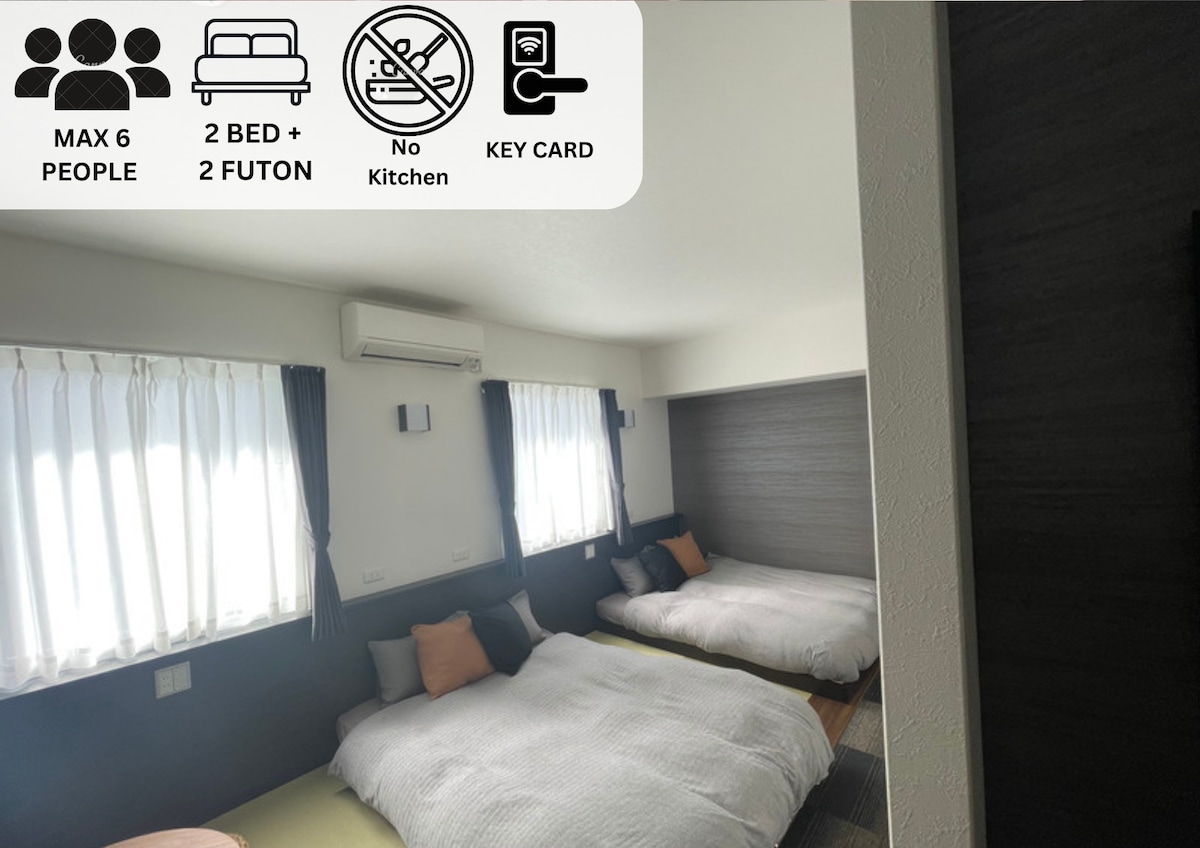 民泊専用のセミセルフホテル シンプルに必要なものだけを備えています。 滞在中の清掃やリネン・タオル交換は行っていませんが、リーズナブルな価格です。 3名以上宿泊可能の部屋。30㎡ 家族・友人で1部屋に泊まることができます ダブルベット2台と日本式布団セット(2組)があります。 この部屋にあるトイレと風呂はseparate toilet・separate bathroomです。 南海新今宮駅・JR新今宮駅からリスティングまで徒歩で1分です。駅のすぐ隣にあります。 地下鉄動物園前駅からリスティングまで徒歩で5分です。 関西空港から直通40分。乗り換え無し。 新世界エリア、天王寺エリアまで徒歩で約10分です。 なんば(道頓堀)や心斎橋まで電車で約15分です。 USJまで電車で約25分です。(乗り換え1回) 近くにスーパーやコンビニエンスストア・ドラッグストアがあります。 タオル交換は有料(事前の申込が必要) 荷物預かりは有料(事前の申込が必要) アーリーチェックイン・レイトチェックアウトは有料(事前の申込が必要)
