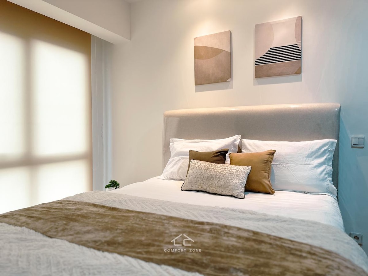 BRAND NEW & Modern interior, equipped with vinyl wooden floor and warm droplights. The unit is equipped with a sofa, 40" SMART ANDROID TV, working desk and smart strip, it’s own bathroom, a queen-sized bed, a spacious wardrobe cabinet, and a balcony that overlooks the city. Kitchen basic utensils are also provided for LIGHT cooking. The unit is also surrounded by tons of facilities for better quality life (swimming pool, thematic garden, children playground, & skybridge access to mall SMS).
