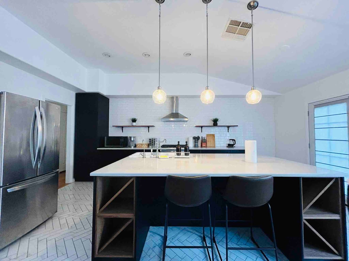 The beautiful 3-story home is 1 bedrooms , 1.5 bathrooms and with a den downstairs . The den room has a pool table . There are ceiling fans throughout the house. The upstairs primary room windows offer a rare wide strip view. There is the queen-size bed and TV in the bedroom . Additionally, there's a separate dining area with a kitchen combo featuring granite countertops.