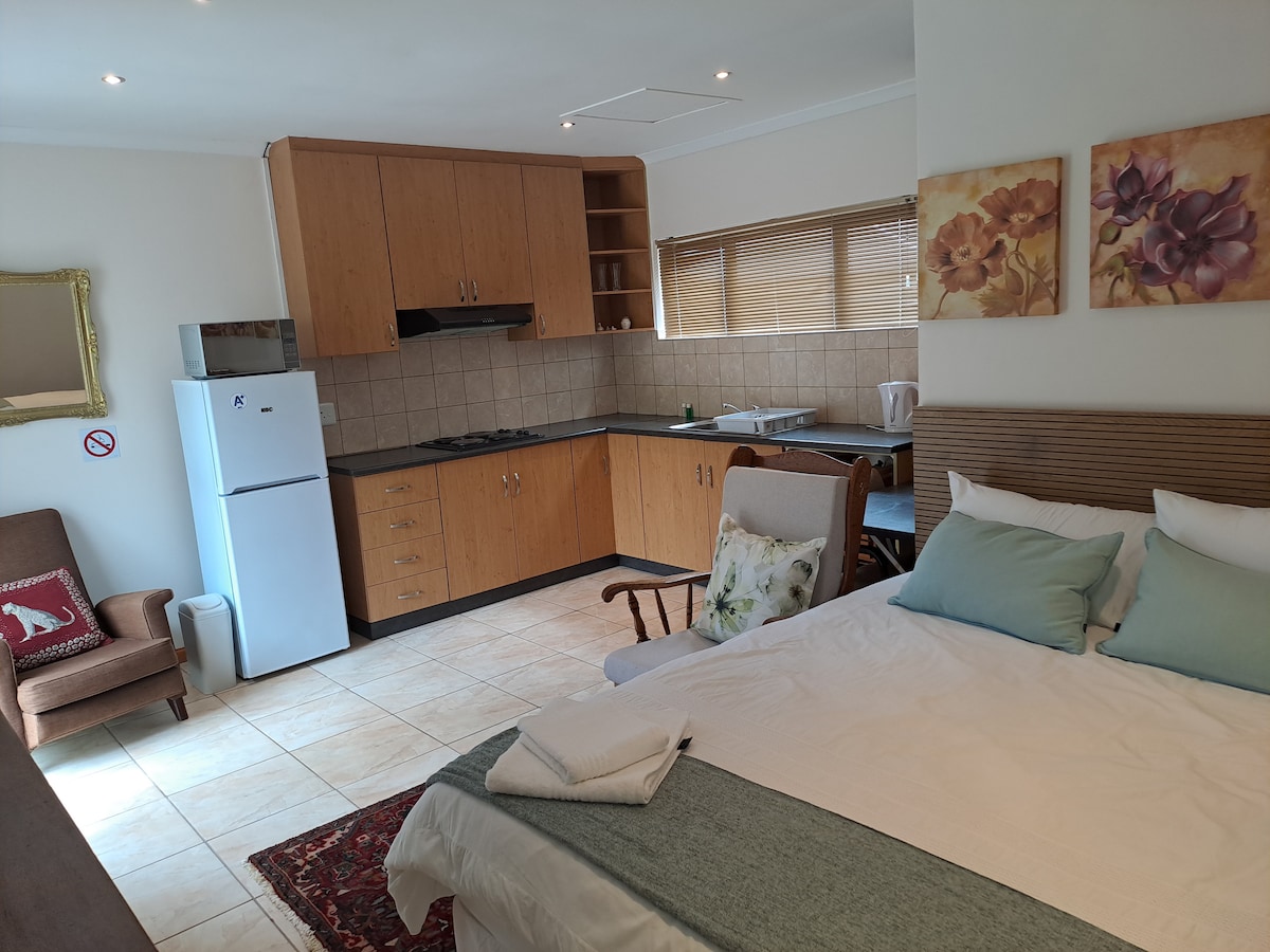 A one bedroom, self-catering and self-service cottage in the leafy suburb of Mount Pleasant. The unit is free standing next to our home with your own separate entrance to come and go as you please. Spacious and secure offstreet undercover parking with remote access. The open plan living space includes a lounge area with smart TV (Netflix and OVHD decoder) and a dining/workspace area. The kitchenette is fully equipped and includes a fridge, mini oven with two plate stove and a microwave.