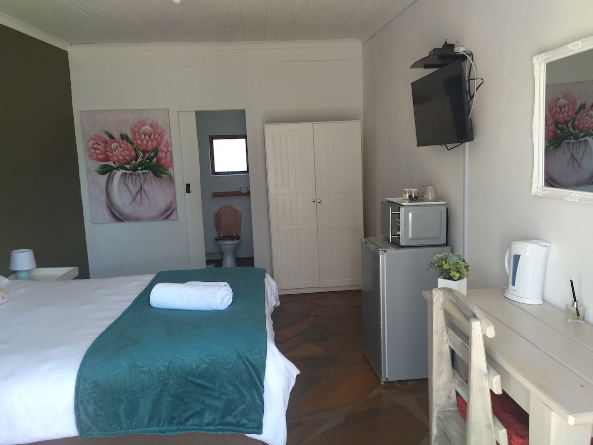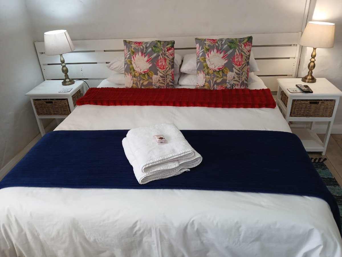 Ideal for short stays. Secure off-street parking. Convenient position - 5 mins from Airport, St George's Park, Grey schools. 7 mins to Beachfront. 35 mins to Addo Elephant Park. Located in the garden of a family home and the owner's art studio. Full en-suite bathroom the kitchenette has a kettle, microwave and fridge. Queen double bed, free Wifi, solar electricity. Extra single mattress can be placed on the floor at no extra charge. Cafés, shopping centre within 5 minutes walking distance.