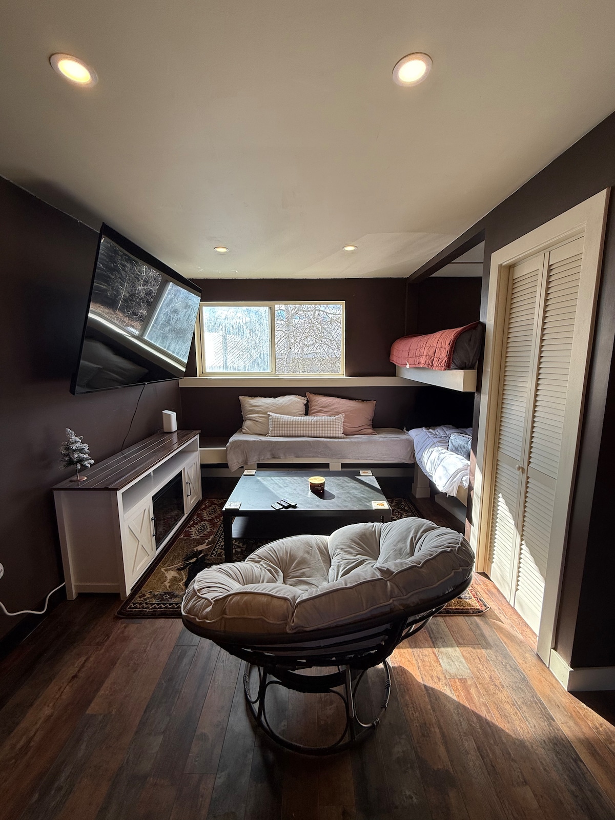 PLEASE NOTE: Pool complex closed April 27th-mid May 2026 Early check in/Late check out not available. Kick back and relax in this calm, stylish space. Our warm and welcoming condo is nestled in a quiet but convenient area very close to lifts and town. Cozy up to the gas fireplace, Relax on the covered deck Adirondak chairs with coffee or a cocktail. Use the provided robes to take an easy stroll to the pool and hot tubs after a day of skiing or hiking. Mountain luxury is just a click away!