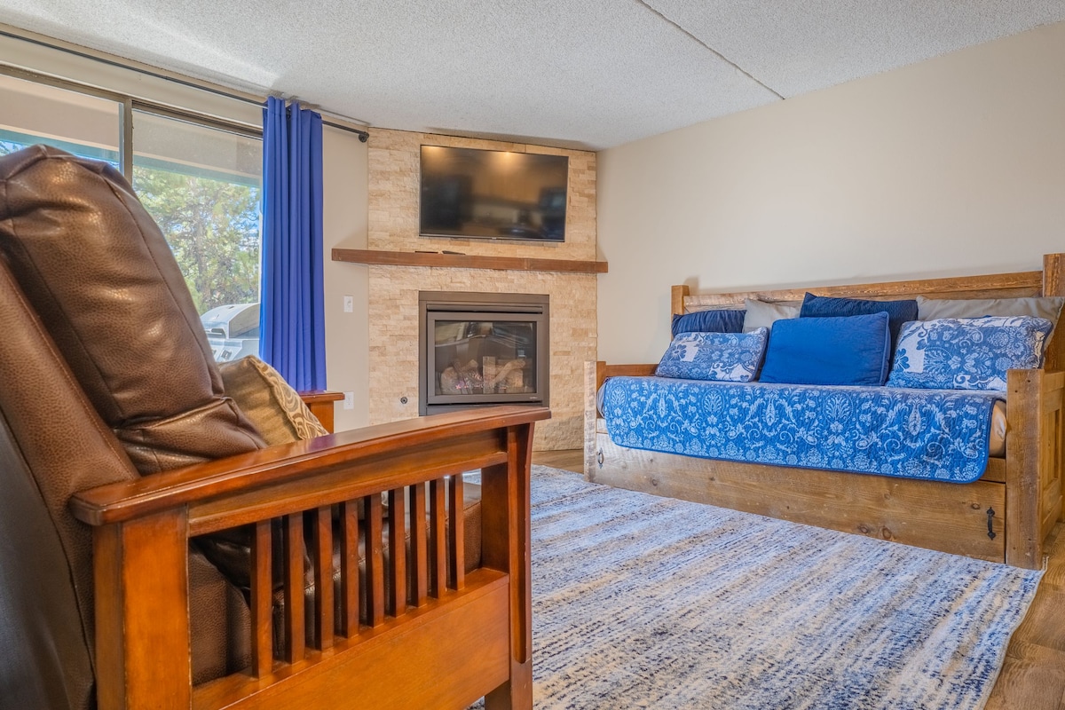 Please note. Early check in/Late check out not available. Kick back and relax in this calm, stylish space. Our warm and welcoming condo is nestled in a quiet but convenient area very close to lifts and town. Cozy up to the gas fireplace, Relax on the covered deck Adirondak chairs with coffee or a cocktail. Use the provided robes to take an easy stroll to the pool and hot tubs after a day of skiing or hiking. Mountain luxury is just a click away!