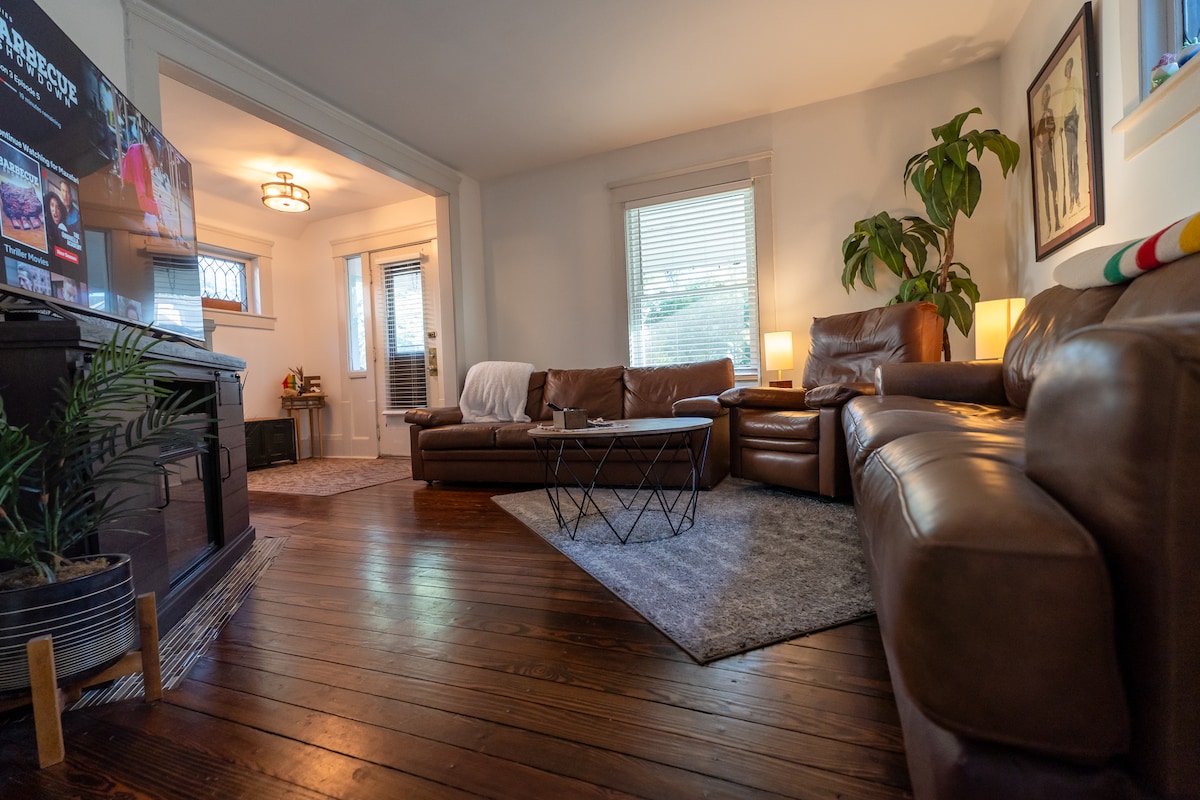Enjoy a comfortable experience at this centrally-located home 1 block away from the strip in Highland Square. Central air, 2 bedrooms with brand new queen beds. Large kitchen with dishwasher. Netflix & Prime Video on tv's. Comfortable leather couches, front and back deck, and fire pit. Being 5 minutes from Downtown Akron, 35 minutes from Downtown Cleveland, and 10 minutes from Cuyahoga Valley National Park, there is a lot of nightlife, hiking and biking in the area. All are welcome!
