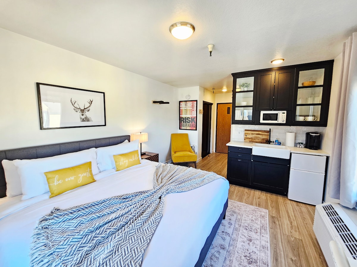You will enjoy easy access to everything from this centrally located Prospector Square studio. Stylishly decorated, so cozy, and perfect for two. The studio is located in the Carriage House which is steps away from the bus stop, less than a mile from Main Street, amazing restaurants within walking distance, and across from the historic Rail Trail. The space offers a comfortable king size bed, desk for work or space for a bite to eat. There's an electric cooktop, mini fridge, and a Kuerig.