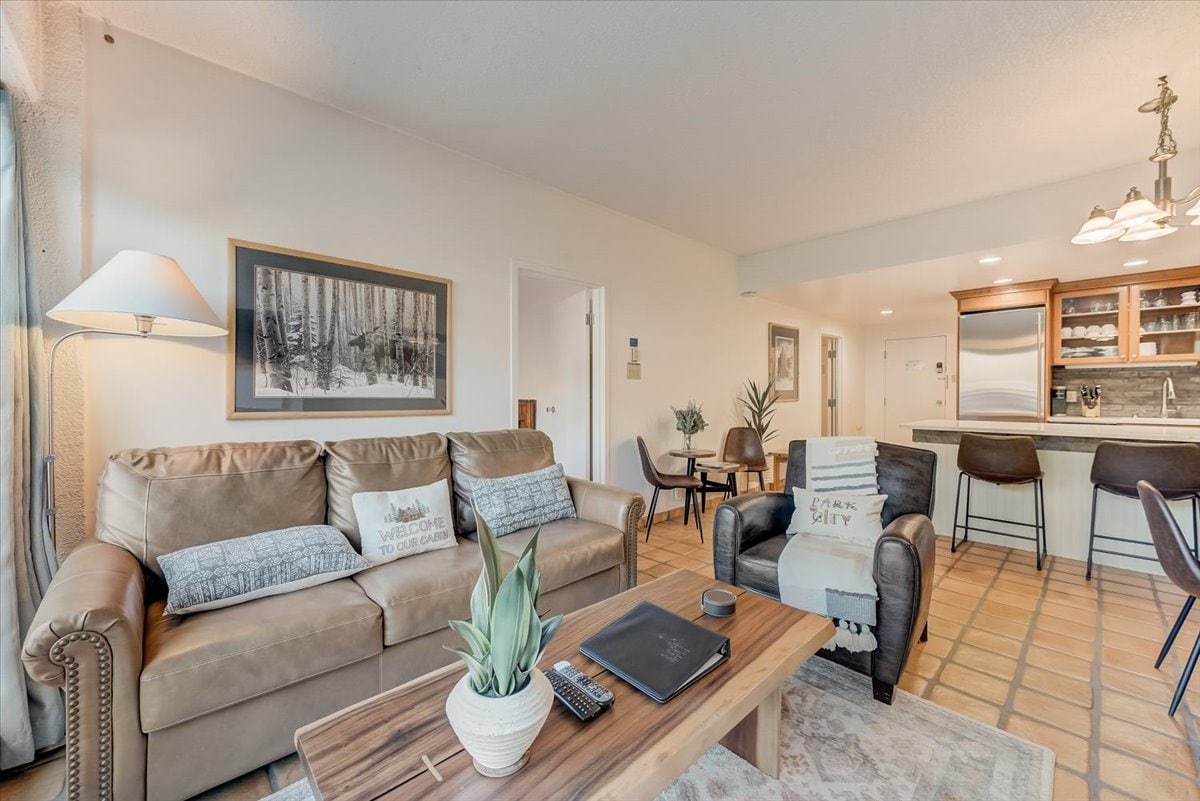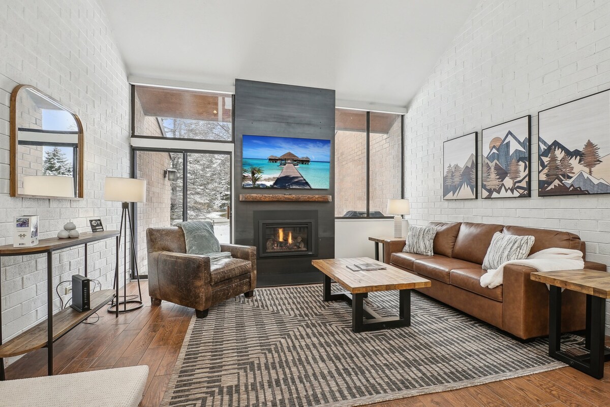 Modern, cozy, comfortable and convenient! View of the slopes right from the living room. A quick, easy WALK TO THE MOUNTAIN for skiing, mountain biking & hiking. After a day out, step out the front door to the relax in the HOT TUB + POOL! (open summer + winter) WALKING DISTANCE to shops and restaurants on historic MAIN ST. FREE PARKING for guests (one car) in front of the condo. A queen bed in the bedroom plus a comfortable pull-out couch in the living room for additional guests.