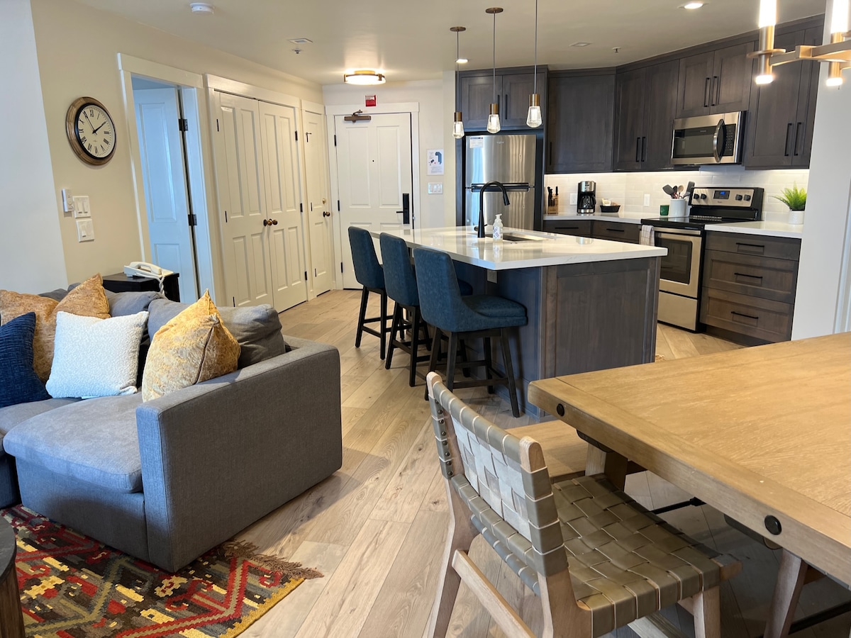 Modern condo (sleeps 4) at Canyons Village. This 600 sq. ft. one bdrm condo (with huge patio) features cozy upgrades, spa-like bathroom, spacious living area with floor to ceiling windows (and Murphy bed in living room to easily sleep another couple or kiddos), Kitchen with fridge, microwave, toaster oven, dishwasher and coffee. *All Resort Fees Included *NO RESORT FEE FOR 30+ DAY BOOKINGS *Pool, Hot tub, and gym (Peloton) *Free game room *20% off ski rentals *Ski Valet