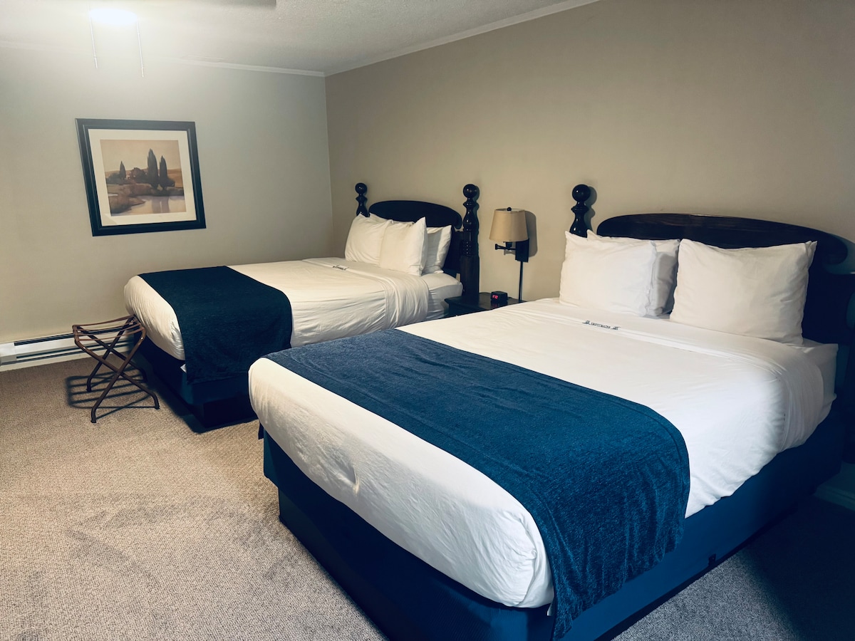 The Wasatch Standard is your classic hotel room set up with two double beds. The room includes a writing desk, Roku TV, counterspace, minifridge, warm lamp lights, and a place to hang your things - everything you need to relax and unwind. The bathroom features a walk-in shower stocked with Soapbox Soaps, a vegan and cruelty-free company that proudly supports developing communities around the world.