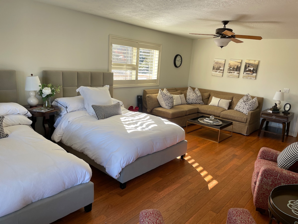Cheryl & Curtis would like you to join them at Sage Hill, a rejuvenating mountain lodge sanctuary nestled in Park City's Wasatch mountains. You’ll love it because of the views, location, quiet and privacy. Your private suite includes a bedroom with queen bed and ample closet space, full bathroom, and large living room with vaulted ceiling, 64” TV, leather sofa and recliner - all on a separate floor. Entry shared with hosts. Additional guest sleeping option is a comfortable queen sofa bed (+$30.)