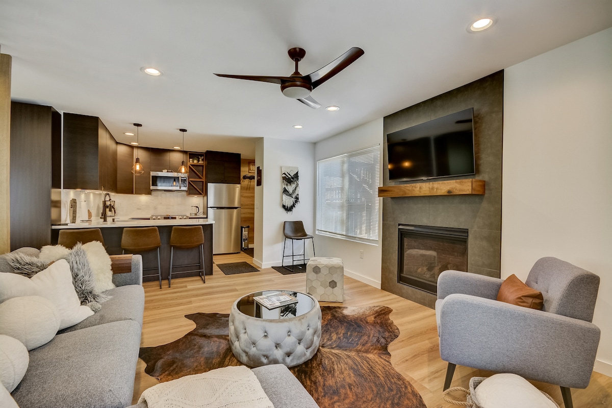 Relax in this beautifully designed two-level mountain condo at the base of Canyons. This family-friendly home has been thoughtfully designed, blending modern chic with a cozy rustic mountain feel, including vaulted ceilings with exposed wood beams and a stone fireplace. Located a short walk to the Cabriolet lift, there is no better starting point for your mountain adventures. Return home for a comfortable evening by the fire and your own private patio for grilling and taking in the views.