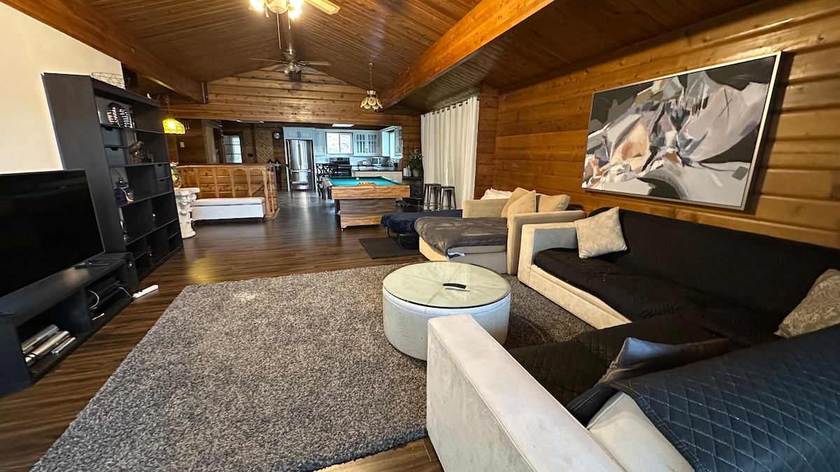 Take it easy at this unique and tranquil getaway. The place consists of the main floor of a beautiful house built with wooden logs. Originally were two private units/ separate entrances that are connected with a passage door, 5 bedrooms and 2 bathrooms will accommodate 11people. If say, a honeymoon couple would need their own entry for privacy, own bathroom, mini kitchenette, this is the perfect layout, while the rest of the family (in-laws, friends) will have the other part of the house.