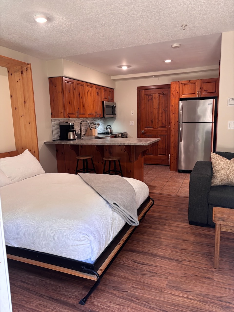 222 in Fireside Lodge is a spacious studio suite situated in the heart of the village, and provides underground parking, ski/bike locker, easy ski-in/out access to main lifts, restaurants and shopping. Ideal for a couple, solo traveler or small family. Enjoy watching shows on the wall mounted TV or soaking in the hot tub shared among Fireside guests. This home sleeps up to 4, with a queen bed and queen sofa bed. Please note, this is a studio suite, not a separate bedroom.