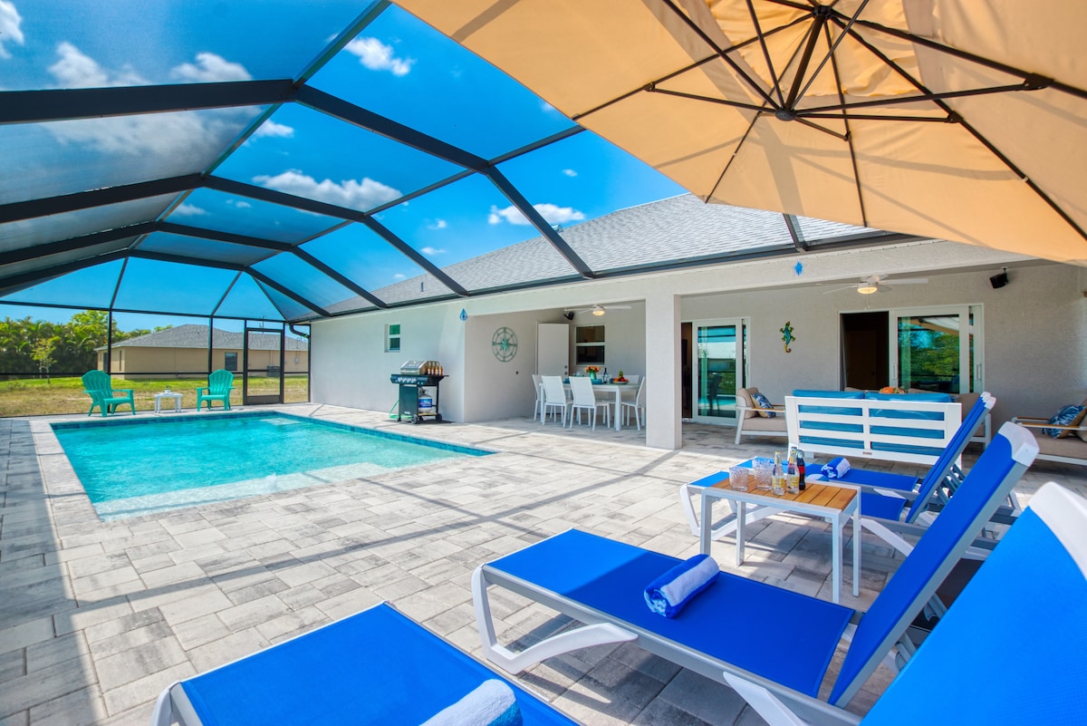 Villa510 is a newly built waterfront retreat ideal for extended stays in Cape Coral. Enjoy peaceful salt canal water views and manatees from the lanai, then relax in your private heated pool and spa—perfect year-round. The outdoor kitchen and lanai create an easy, comfortable daily routine. Inside offers three private en-suite bedrooms, a den with optional airbed, open living space, and TVs in every room. Close to shopping, dining, and beaches—perfect for snowbirds seeking comfort and ease.