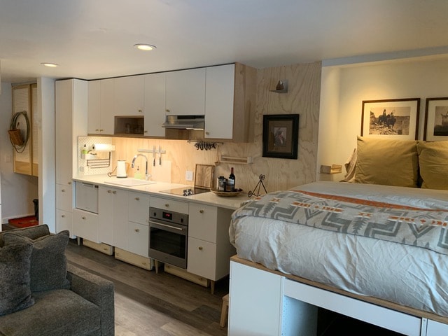Located in Elkhorn Village with serene outside ground-level entrance and one heated underground parking spot allows for great convenience for your visit. The Tiny Condo will offer you the opportunity to cook your gourmet meals in the full-size, well-stocked kitchen. As you climb to your loft, you will sleep comfortably in a queen-size bed, which is above a queen-size master bed. These cozy sleeping quarters will allow your family and friends to be comfortable in an affordable accommodation.