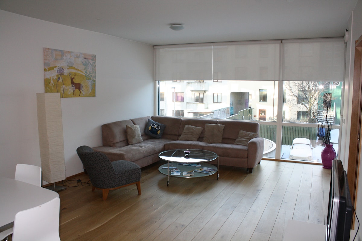 Stylish and comfortable Penthouse apartment right in the center of Reykjavik. Just 2 blocks off the main street in a very quiet neighbourhood. The main shopping streets, restaurants, bars and museums all within 5-10 minutes walking distance. Equipped with everything you need for a short or medium-term stay. Very close to tour bus stops #6 and #14 (see busstop dot is).