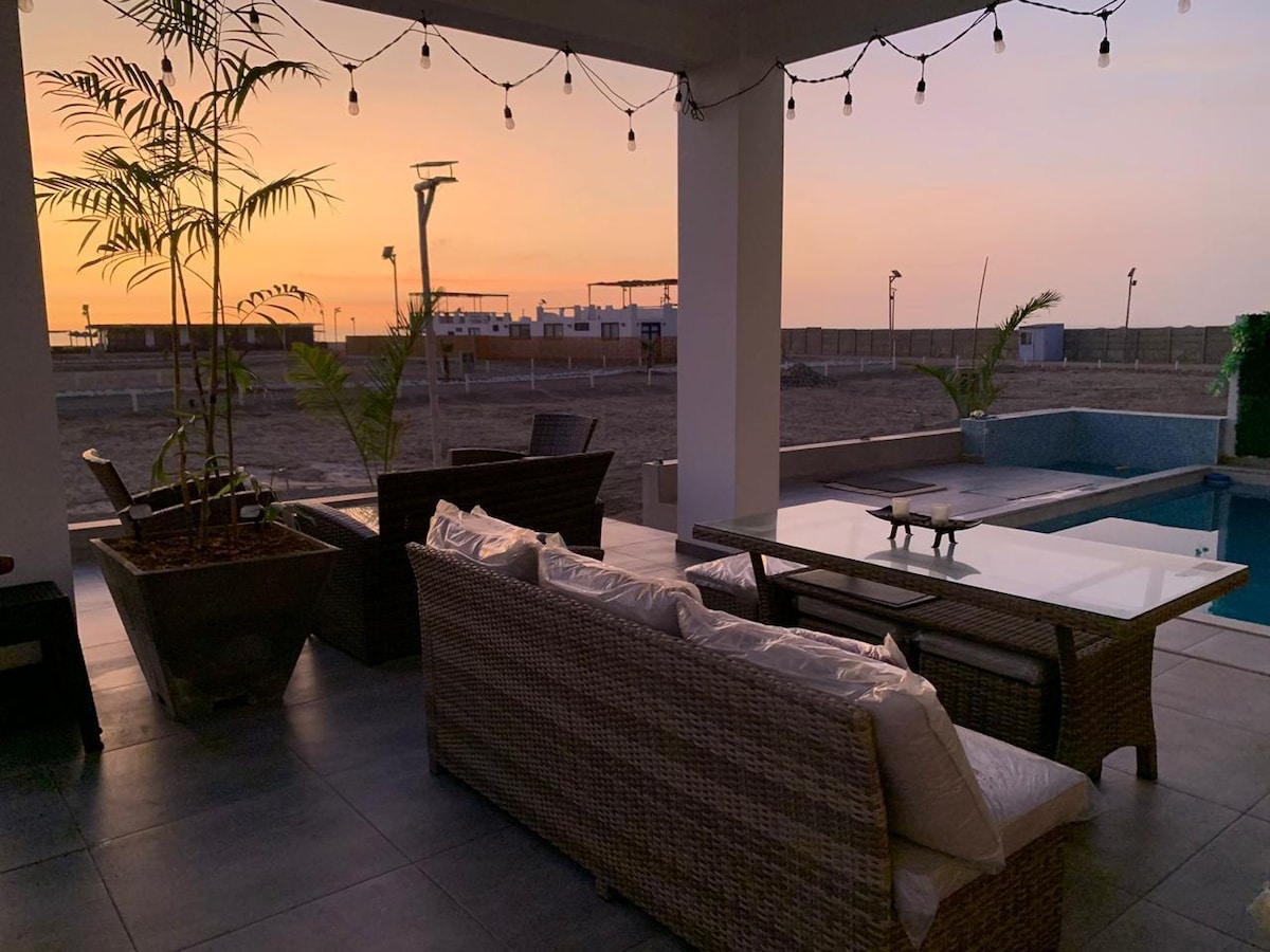 Bonita casa de playa en primera línea, vista hermosa y directa a toda la inmensidad del mar, desde la terraza en el primer piso, desde la cama y el balcón principal en el segundo piso, desde la ventana de la cocina, desde las mamparas de la sala, desde la mampara de la sala de estar, desde la puerta al cotado del bar. Relájate en este tranquilo lugar con la brisa marina, el cielo azul y el sonido de las olas. Descansa en la hamaca o en las tumbonas!!! Refréscate en la piscina de la casa!!!