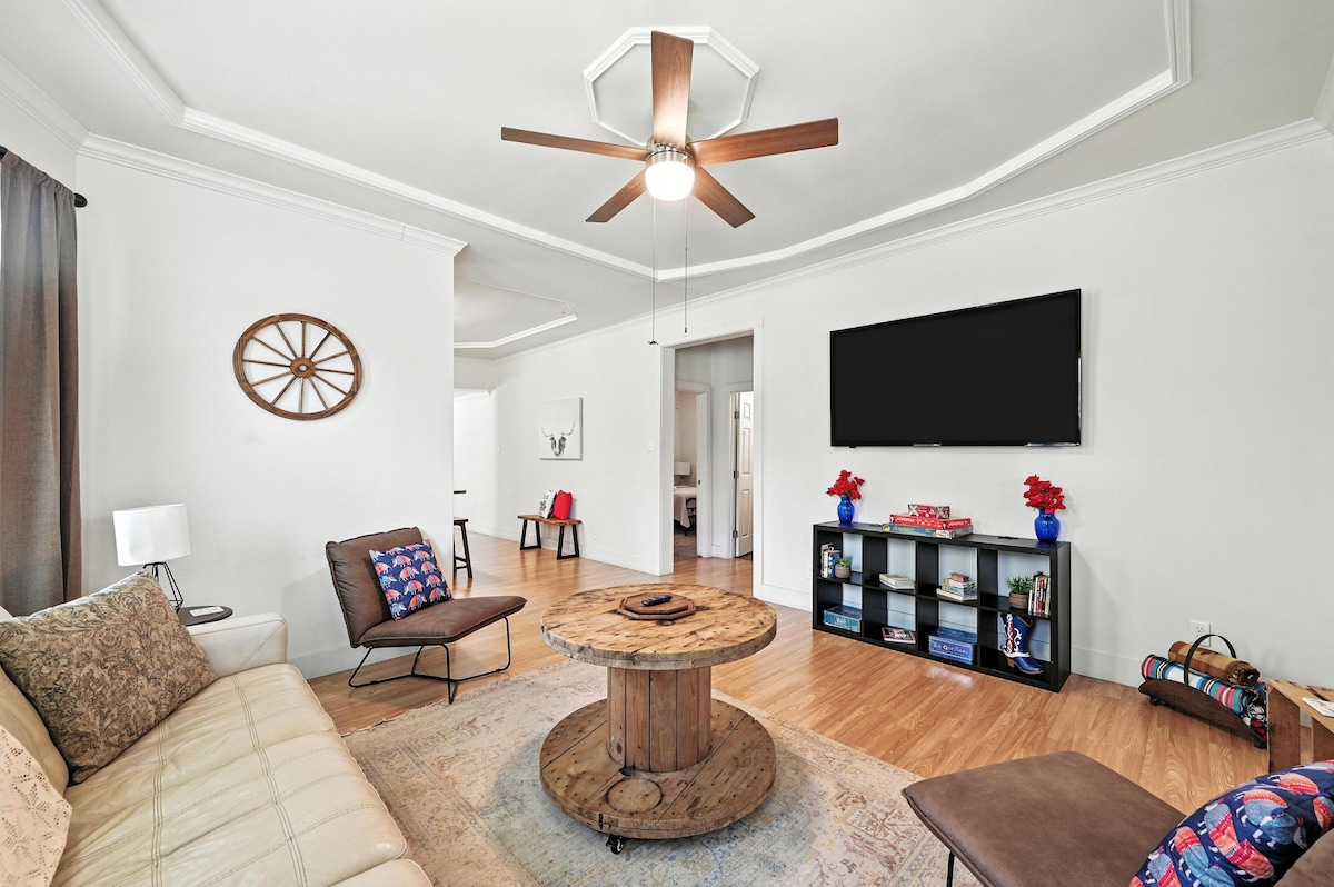 Welcome to our Cowtown-themed one-bedroom in the heart of downtown Fort Worth! Set in a historic 1936 building, the space features 20ft ceilings, large windows, and a fully equipped kitchen. Just 4 blocks from the Convention Center and 2 blocks from Sundance Square, with walkable access to the train station, coffee shops, restaurants, and boutiques. A perfect home base for exploring everything Fort Worth has to offer!