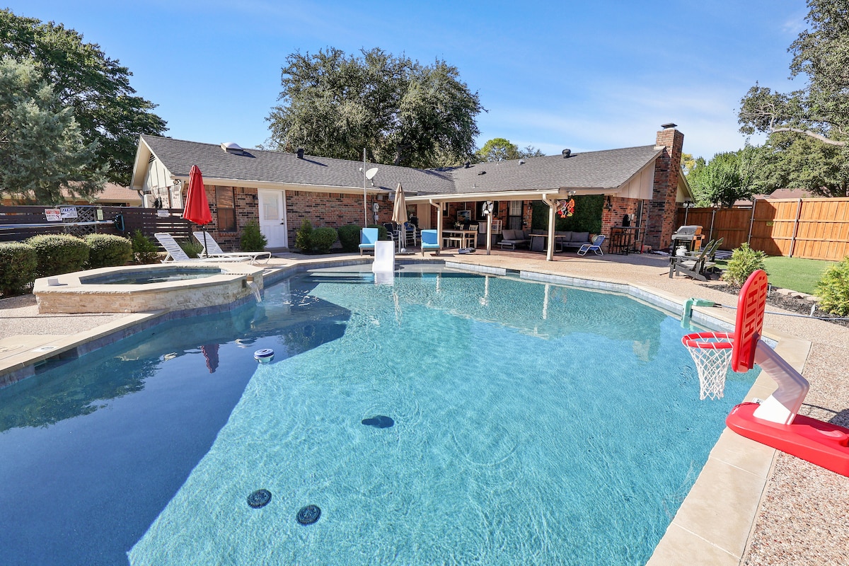 Relax and fun with the whole family with our little Oasis in the center of Dallas - Fort Worth Metroplex. Backyard has a pool, tanning chairs, gazebo with flat screen tv, a fire pit, you can even watch tv in the hot tub! This is a 3 bedroom private home, with 3 queen size beds, and 2 twin beds. The master suite has a full bathroom, and a door leading to the pool area. The home has a billards table, ping pong, and board games! Tons of cooking utensils, a new dishwasher/ fridge, air fryer etc!