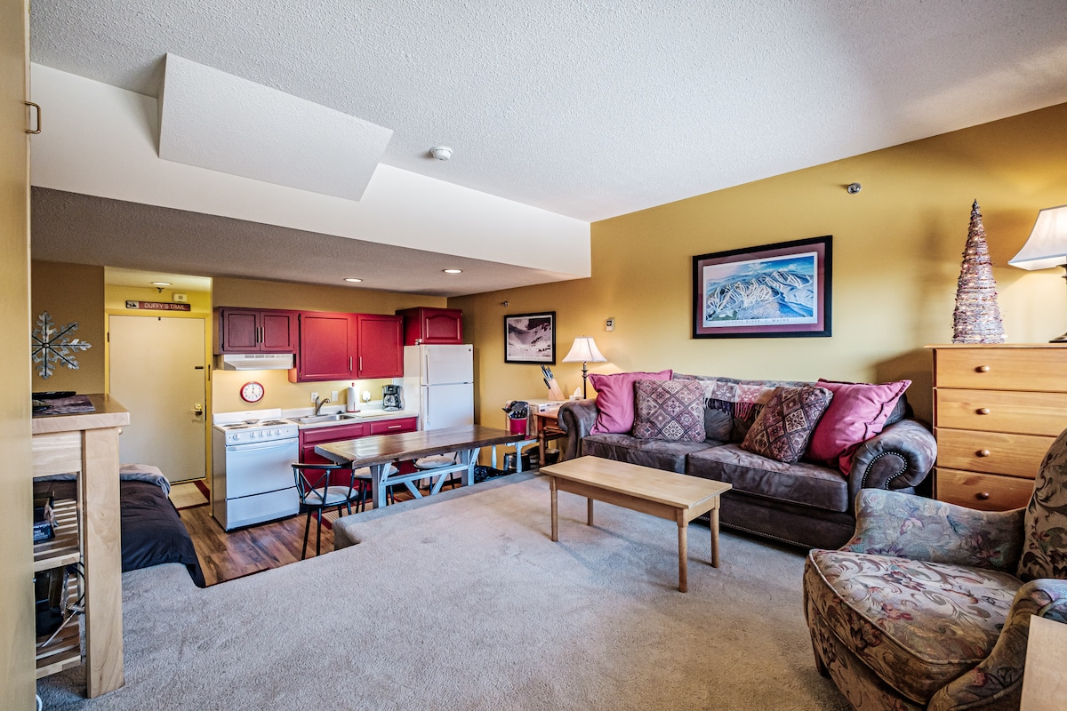 Less hassle = more fun! Literally wake up , enjoy an easy breakfast, strap ski boots on & walk out to roadrunner trail. Dreamy vacation in this Sleep 3 slopeside studio condo. HOUSEKEEPING INCLUDED IN RATE. Walk to slopes & outdoor heated pool with huge hot tub open daily 11am - 9pm during ski season. Plush queen bed on living room level with views of white heat- no sofa, 1 easy chair and twin bed on kitchen level. Fully equipped kitchen, flat screen Tv & wifi. Brookside building #2 - unit A210