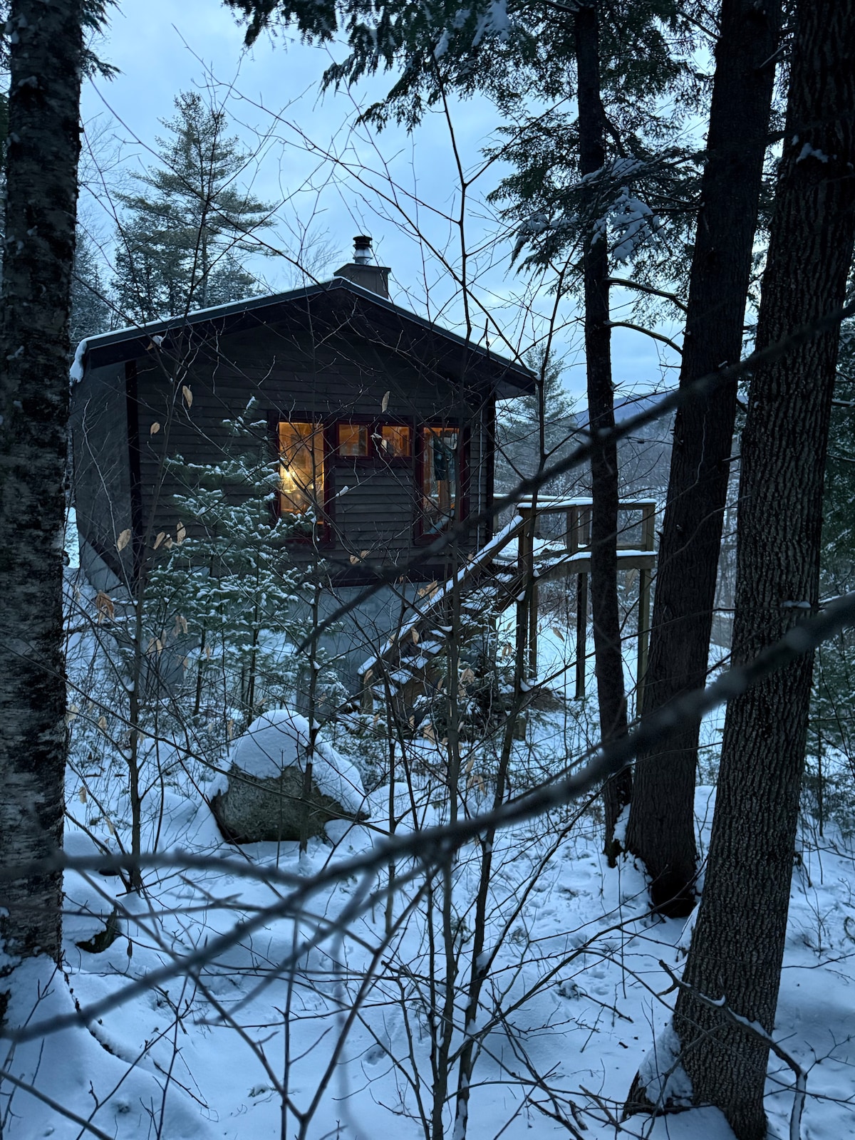 We built the Wren Cabin to be a serene space filled with light and art and with lots of cozy details. Lofted ceilings, a spiral staircase and large open concept with lofted bedroom. The cabin also has a gorgeous wood-fired sauna for those colder days. Wren cabin has a large wraparound deck for relaxing and an outdoor fire pit, as well as shared access to Adams Pond. The space is modern Scandinavian, light and aery, and filled with thoughtful details.
