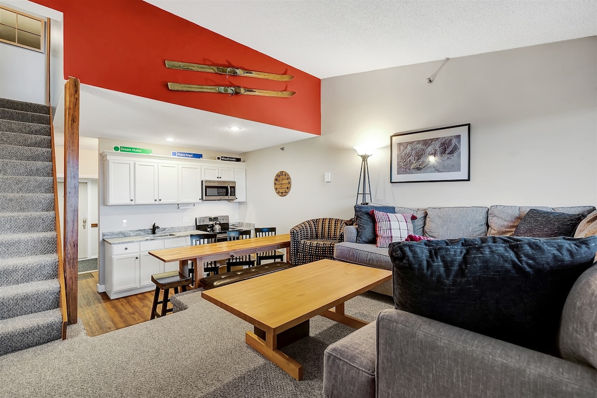 This two-floor ideally located condo is on the mountain between Barker and White Cap Lodges. You can ski in/out using Roadrunner trail, which is right across the parking lot. There is plenty of parking and the condo is located in Building 2, which is closest to the common lodge area with a fireplace and pool/hot tub/sauna access. While this is technically a 1 br, there is a wall between the queen room and the full/twin room for privacy, and a queen size murphy cabinet bed in the living room.