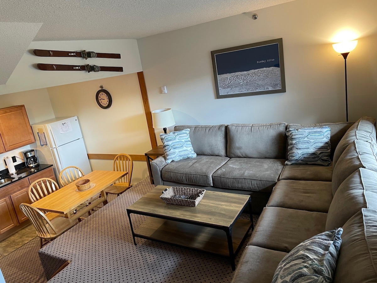 This two-floor ideally located condo is on the mountain between Barker and White Cap Lodges. You can ski in/out using Roadrunner trail, which is right across the parking lot. There is plenty of parking and the condo is located in Building 2, which is closest to the common lodge area with a fireplace and pool/hot tub/sauna access. While this is technically a 1 br, there is a wall between the queen room and the full/twin room for privacy, and a queen size murphy cabinet bed in the living room.