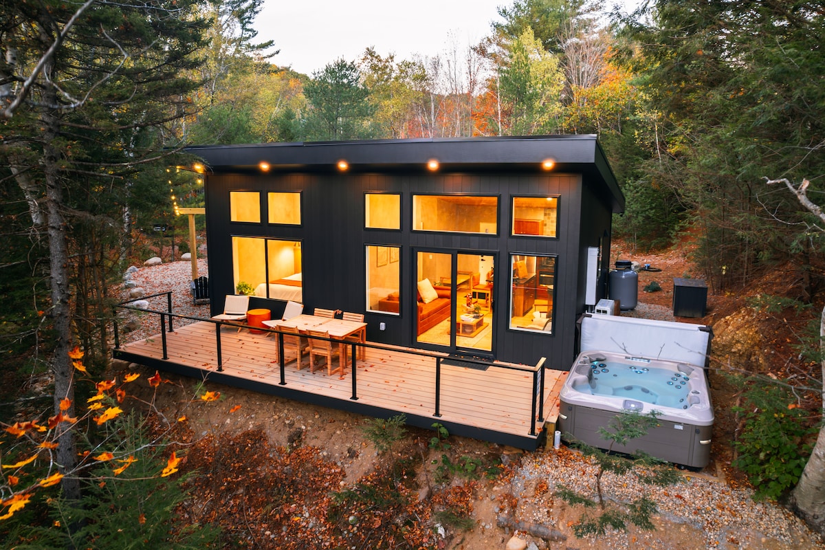 Private waterfront Cabin in woods, nestled off private dirt road near Mt. Abrams and Sunday River. Kayak, swim & fish in pristine lake in Summer. Skate, XC Ski, Ice Fish, Snowshoe, Hike in Winter. Fireplace and Fire Pit. Excellent wifi - Private, quiet remote workspace. Rustic modern cozy decor: fully-equipped stainless steel kitchen with full sized appliances, dishes, utensils, coffee maker. Organic linens. Pristine bathroom-large hot shower area, heat lamp, jetted soaking tub.