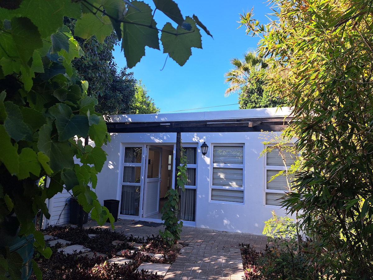 Entire, completely private and free-standing, modern, stylish and spacious, self-catering house is 6 minutes from Airport. Situated in tree filled part of an upmarket suburb, neighbouring the host's safe property, 45m from street. It's EXACTLY as the updated pictures show. Beautiful interior and quality furniture and appliances throughout. Upmarket restaurants and shops under 3 min drive.The private parking for 2 cars and private patio, BBQ, garden, AC and fast WIFI, all for only you to enjoy.
