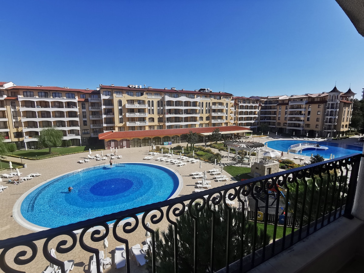 The apartment is situated in the Sunny Beach resort. The beach is only 450m away. Busy district, easy access to main street and the centre with all the communications and places. The popular aquapark is not far. The apartment is fully furnished and equipped, has OWN SEPARATE exit to the swimming pool. The territory is under security. The park zone is nearby, as well as 24/7 supermarket, public transport. To the Nessebar Old town - 10 minutes by bus.