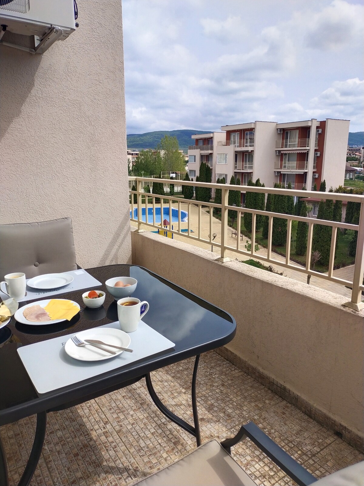 Возможна аренда от месяца и более. Свети Влас. Новый комплекс Sorrento Sole Mare с красивой территорией, бассейном и детской площадкой. Новая квартира, укомплектована всей мебелью и бытовой техникой для комфортного проживания. Двуспальная кровать 160*200 Шкаф, обеденный стол, фен, гладильная доска и утюг, посуда и т.д. Большой балкон с креслами и столиком. К морю 5-7 минут пешком. К магазину 3 минуты. В пешей доступности рестораны, кафе, спортзал, аптека.