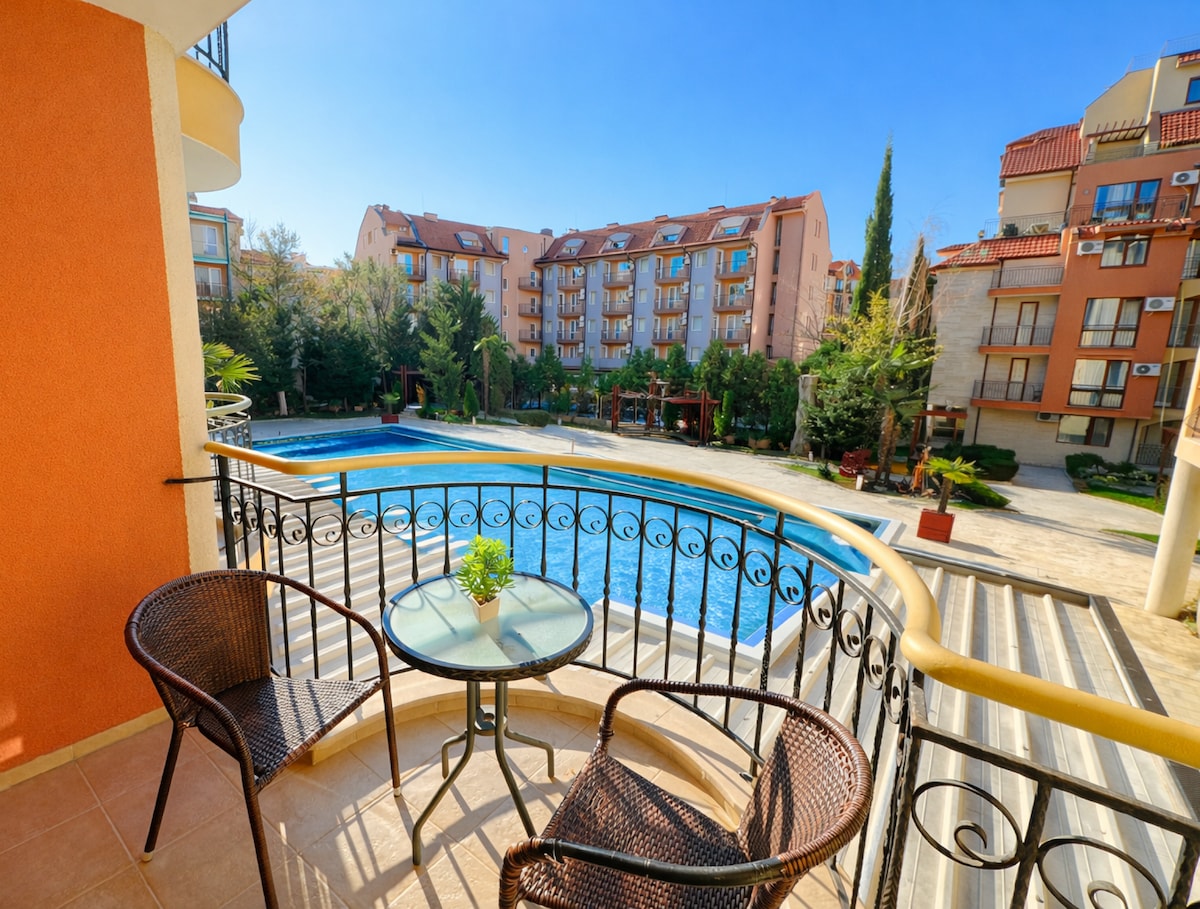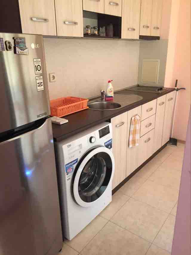 The flat is new and shiny. It is located next to the wonderful golden beach of Sunny Beach - 300 meters walking distance. The building is a new private complex with many facilities such as a swimming pool, a garden, a gym, a reception and a children playground. You have access to all of them. The apartment has all needed conditions for your holiday - fully equipped kitchen witch contains a dishwasher machine, an oven , hobs, a refrigerator, kitchen utensils . There is also a washing and a drying machine, a large bathroom. The balcony has a great view to the garden and the mountains. It is a perfect place for morning coffee. In front of the building are placed two supermarkets. There is a desk for touristic destination-tickets for Aquapark,taxy station, excursions, trip with horses.