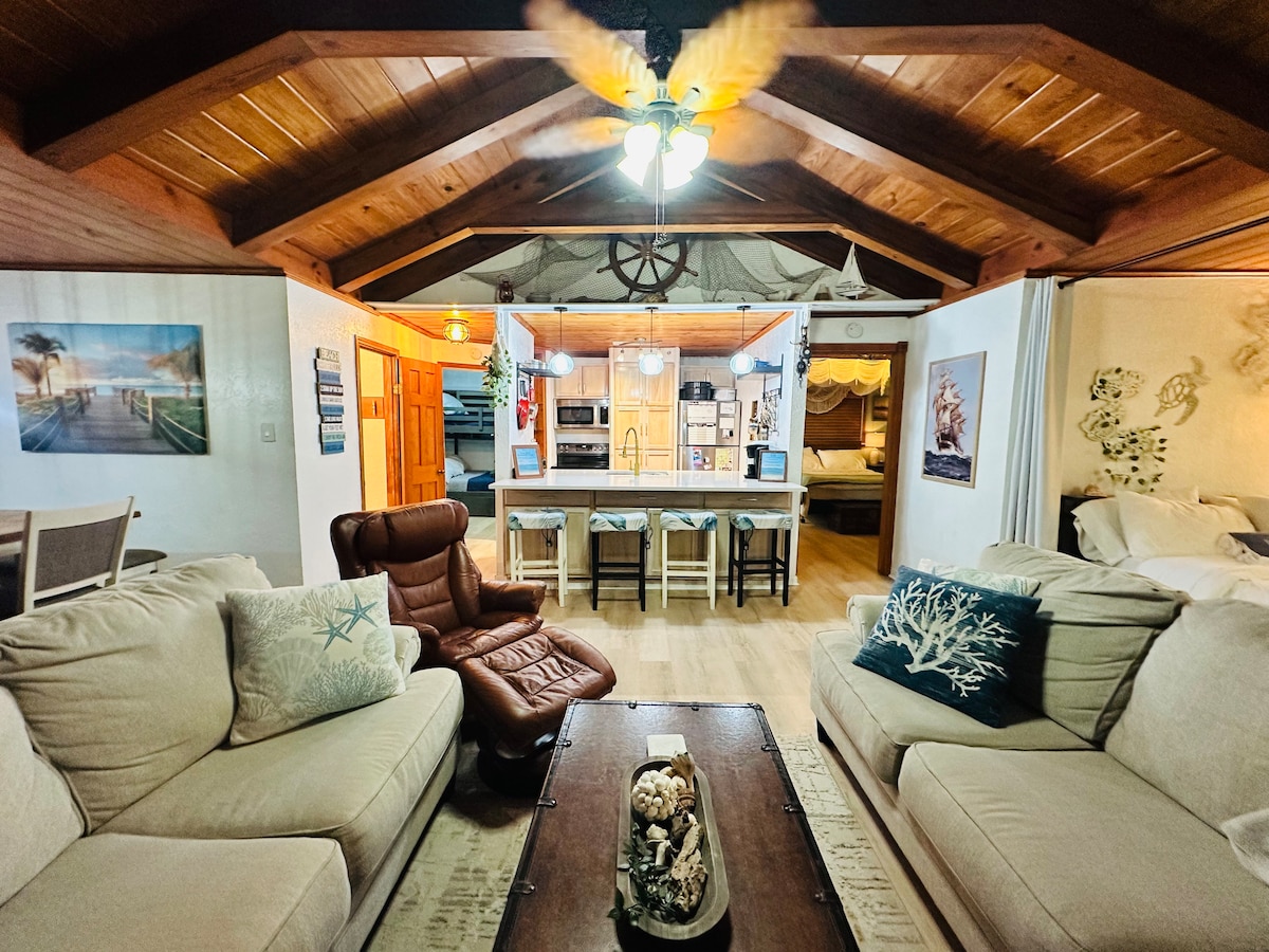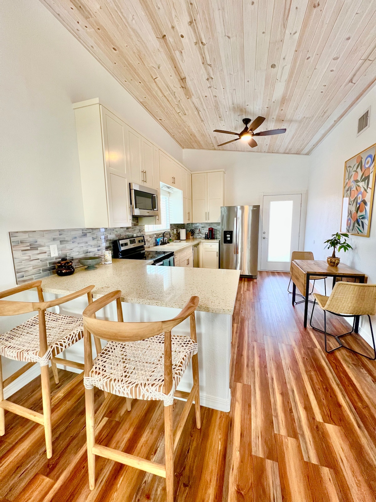 192 SQ FT Tiny House perfect for 2! It's a small space but it packs a ton of punch! Space includes a Queen size bed, 40'' Smart TV with subscriptions, space to sit and eat, kitchenette with mini fridge/freezer, coffee bar, microwave and stand up shower. There is one common sink that is right outside the bathroom door. Under the outdoor pergola is a great place to have your morning coffee or relax after a day at the beach. There is also an outdoor shower right outside the house! Come enjoy!!