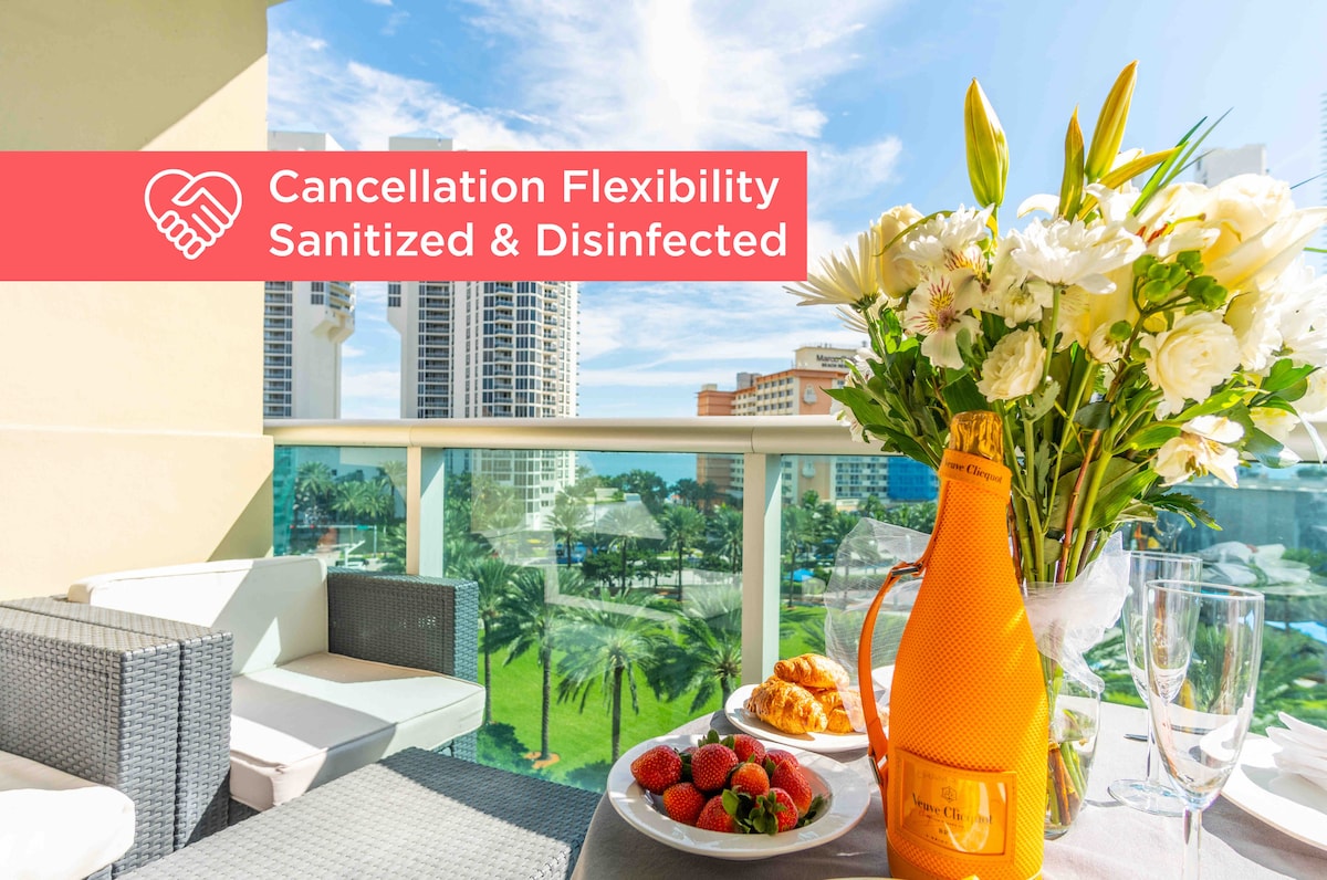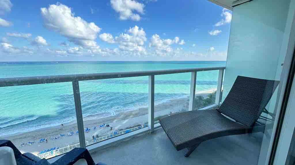 The condo is in Sunny Isles Beach Florida's Riviera, safe, clean, family friendly. On the beach and stretching across the whole beach front of the building. Offering 180 degree direct ocean views from both bedrooms and living room. 2 ensuite bathrooms plus half bathroom. No Carpeting. No resort fees. Full service building on a pristine beach in an upscale area. Super comfortable, 600 thread count sheets, 86" TV for cinema experience, fully equipped kitchen. Valet parking only $40+tax per day