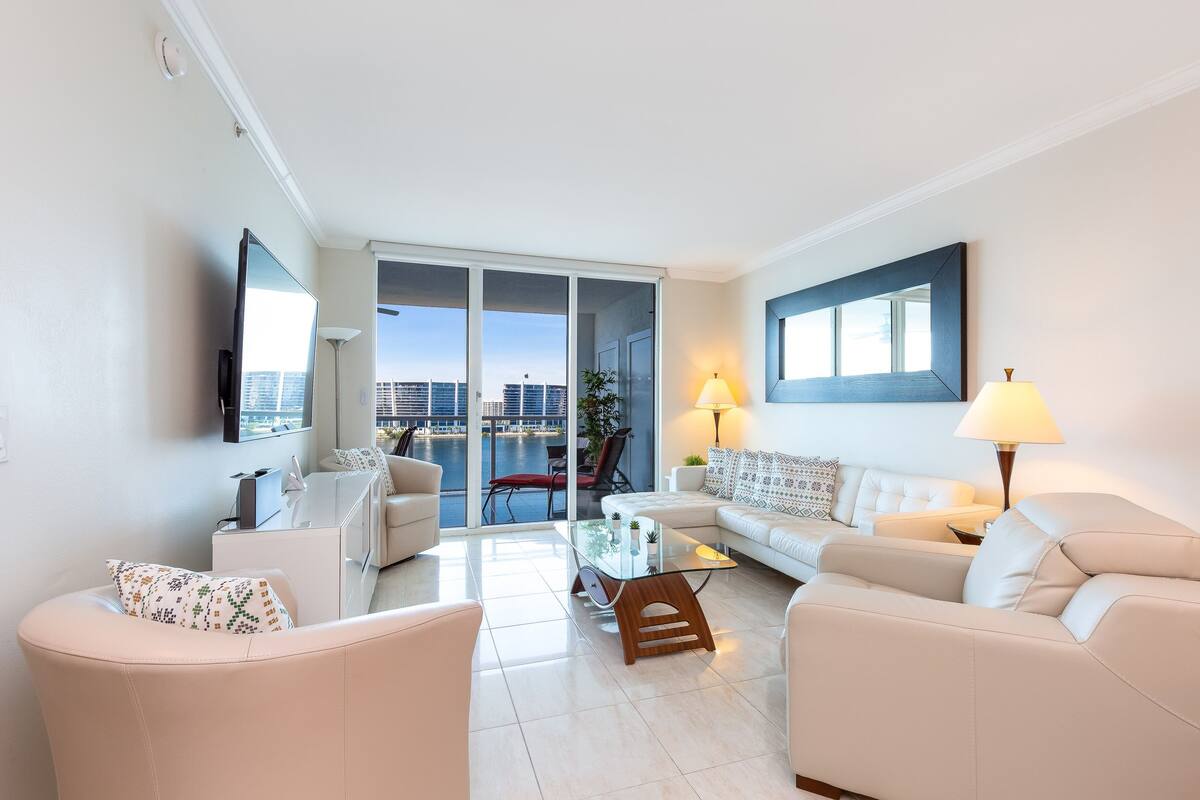 Moderno departamento de 1 dormitorio, 1 baño, 1 Toilette, Living, Comedor , Cocina y Balcon con vista excelente al Intercostal situado en el Ocean Reserve Condominium (19370 Collins Ave, Sunny Isles Beach, FL) a metros de la playa y a 5 minutos del Aventura Mall. Este cómodo apartamento (alrededor de 1000 pies cuadrados) tiene todo lo necesario para su cómoda estadía. Está completamente amueblado y equipado para un máximo de 3 personas.