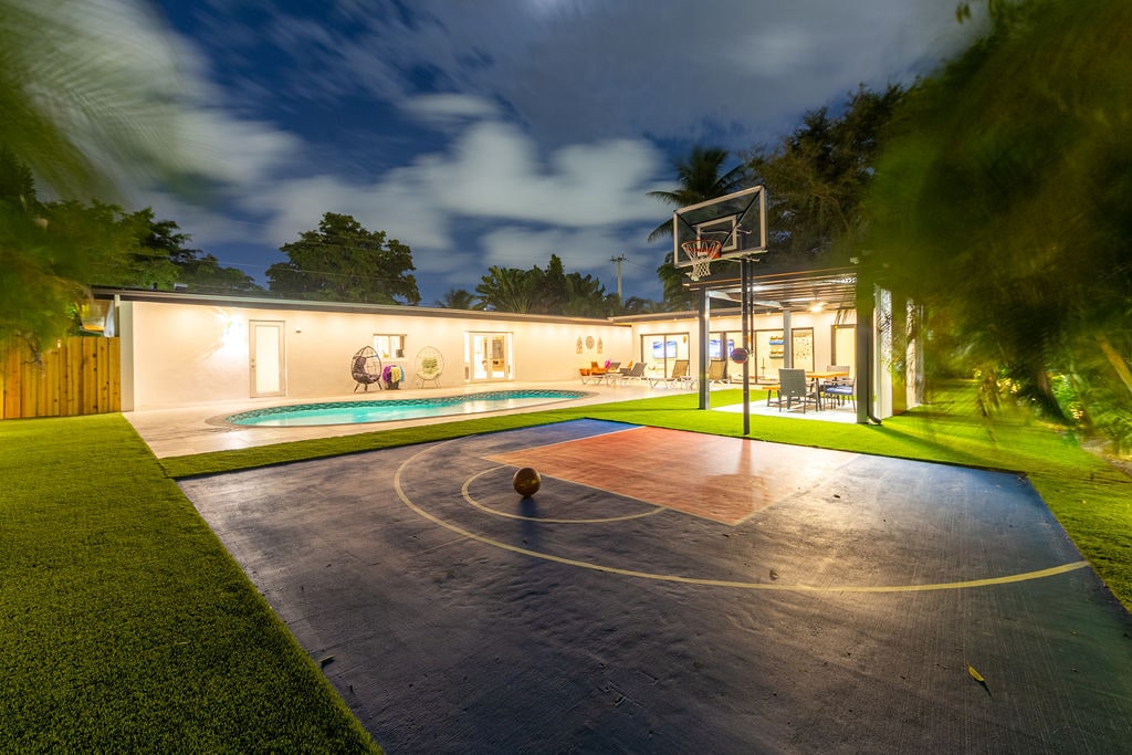 Welcome to our modern tropical oasis, where urban convenience meets resort-like amenities. This home can comfortably sleep 9 people, featuring 3 bedrooms, 2 bathrooms, a colorful game room, inviting living room, and a fully equipped kitchen. Step outside into the expansive backyard, complete with a mini golf course, hot tub, and a charming gazebo with a grill. It's the perfect retreat for endless entertainment and unforgettable memories, and just steps away from numerous SoFlo attractions.