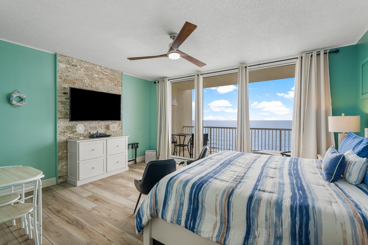 Located in Tower 1 on the 9th floor, our studio offers breathtaking, unparalleled panoramic views of the Gulf of Mexico. This oceanfront condo features standard furnishings and ample space, making it the perfect opportunity for a romantic getaway in one of PCB's most popular resorts: Majestic Beach Resort. This space will feel like a hotel just feet away from the beach. Beach service is included (2 beach lounges and 1 umbrella) from March 1st to October 31st, valued at $60 per day.