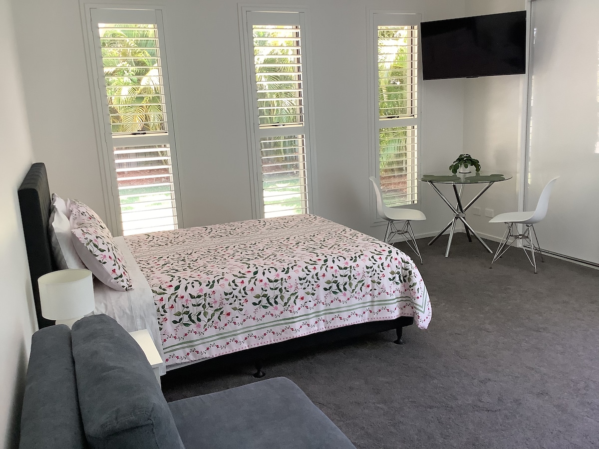 MODERN STYLISH CLEAN self contained studio apartment. A short walk down some steps to Sunrise Beach beach Own private secure entrance & courtyard secluded next to our home. Modern stylish kitchen Luxe large bathroom King Ecosa Bed Large Smart TV/Netflix/WIFI Air Con/fans Washing Machine Best suited for a couple but the studio manages 4 people maximum and has a fold out dbl sofa couch, and a king bed. Free Bus in the weekends Great walking tracks, surf spots and a short drive to Hastings St.