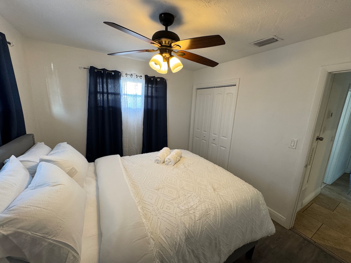 Luxurious Private Studio w/ Private Entrance (440 sq ft- can fit 3 people/2 cars) is attached to our home & 1.7 miles from beach & adjacent to Ft Lauderdale. Park under the covered carport. 1 Queen Bed (& 1 Queen Size-Blow Up Mattress), 1 Bath, Kitchenette, Fiber Optic Wifi, Flat Screen TV (140 channels), Impact Windows, Huge Closet, Fan/light, AC w/ remote, Desk, Chair, fold up/down Table for eating w/ chairs, small Fridge, Microwave, Toaster Oven, Foreman Grill, Hot Plate Stove, Coffee Maker.