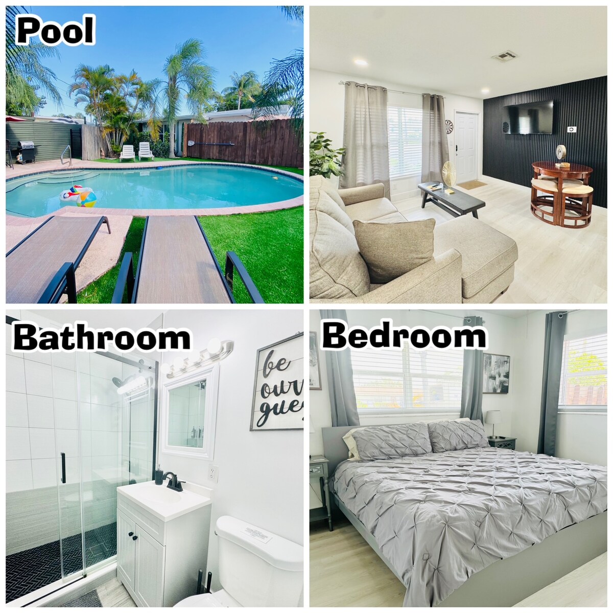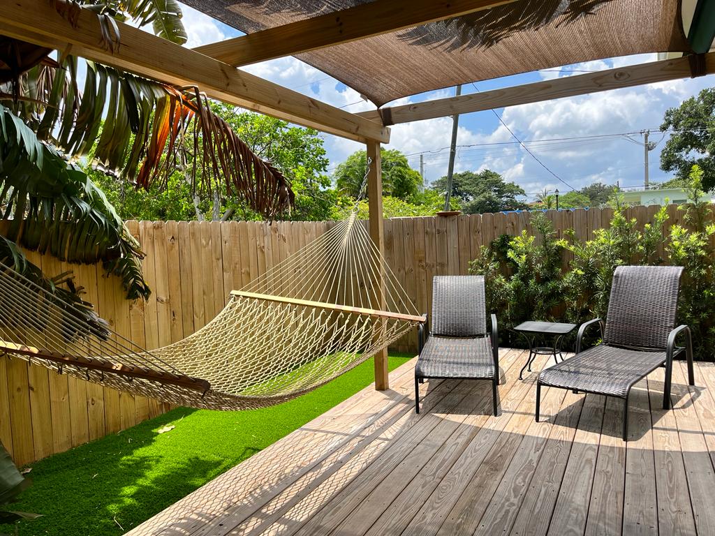 This amazing mini resort has been created with the ultimate comfort of our guests in mind. Enjoy a courtyard and pool deck designed with plenty of outdoor seating and a tiki hut. The property has synthetic grass through out, perfect for kids and family to sit and play on. Super fast Wifi. USB ports in the bedroom. Super comfortable bed. Smart Tv that you can Stream your favorite movies to. Washer/Dryer combo. Outdoor BBQ. Our home is located Minutes from downtown and Hollywood beach/ boardwalk.