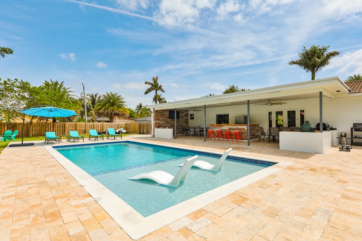 This LUXURIOUS and CLEAN 3 Bed 3 Bath House with a Heated Pool + Outdoor Bar+ Tiki Hut! 20 min drive from Fort Lauderdale Airport + 10 minutes to the beach! 700FT away from 10+ restaurants & several grocery stores! Our home has everything you need at your fingertips! Amenities also include: Complimentary coffee bar, fully equipped kitchen, 70in 4K smart TV's with HULU, NETFLIX, Disney+ FREE, lounge/ beach chairs, and comfy, high end NEW SERTA PILLOW TOP beds and new, quality furniture!