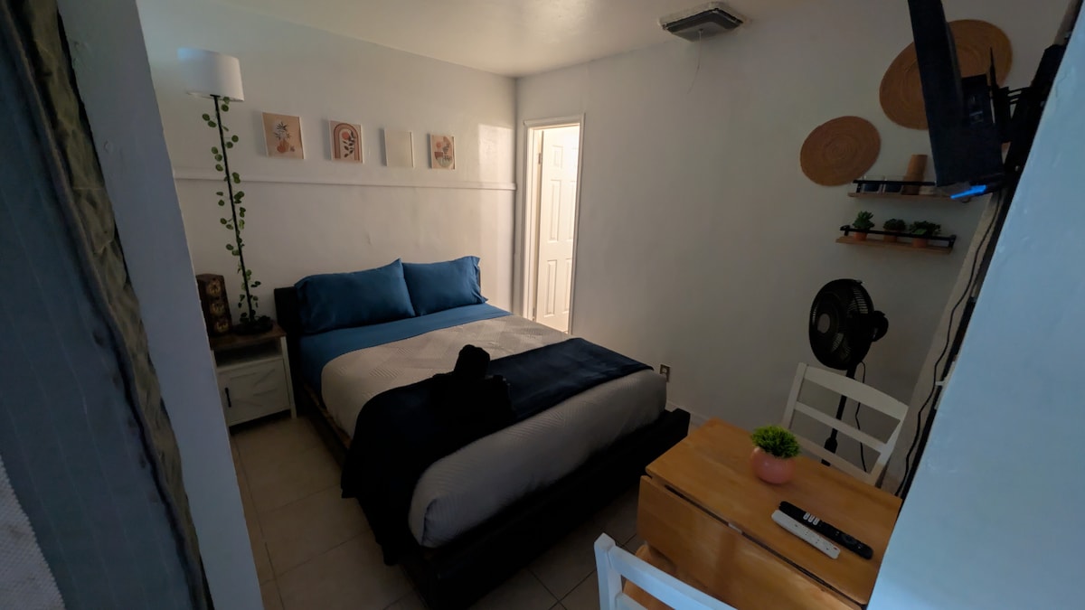 Luxurious Private Studio w/ Private Entrance (440 sq ft- can fit 3 people/2 cars) is attached to our home & 1.7 miles from beach & adjacent to Ft Lauderdale. Park under the covered carport. 1 Queen Bed (& 1 Queen Size-Blow Up Mattress), 1 Bath, Kitchenette, Fiber Optic Wifi, Flat Screen TV (140 channels), Impact Windows, Huge Closet, Fan/light, AC w/ remote, Desk, Chair, fold up/down Table for eating w/ chairs, small Fridge, Microwave, Toaster Oven, Foreman Grill, Hot Plate Stove, Coffee Maker.