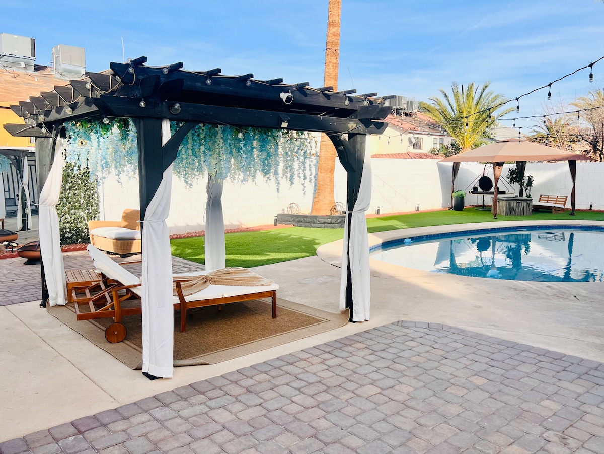 Freshly renovated Las Vegas home away from home with a resort pool oasis, custom fire pit gardens, new modern Clearwater jacuzzi with over 100 jets and water features for you to relax and enjoy, an outdoor kitchen BBQ patio area, and a fun outdoor game area! This single family home with a casita is located minutes from outdoor adventures, strip excitement, and beloved local attractions. Enjoy a relaxed modern Bohemian style with thoughtful touches to ensure a comfortable and memorable stay.