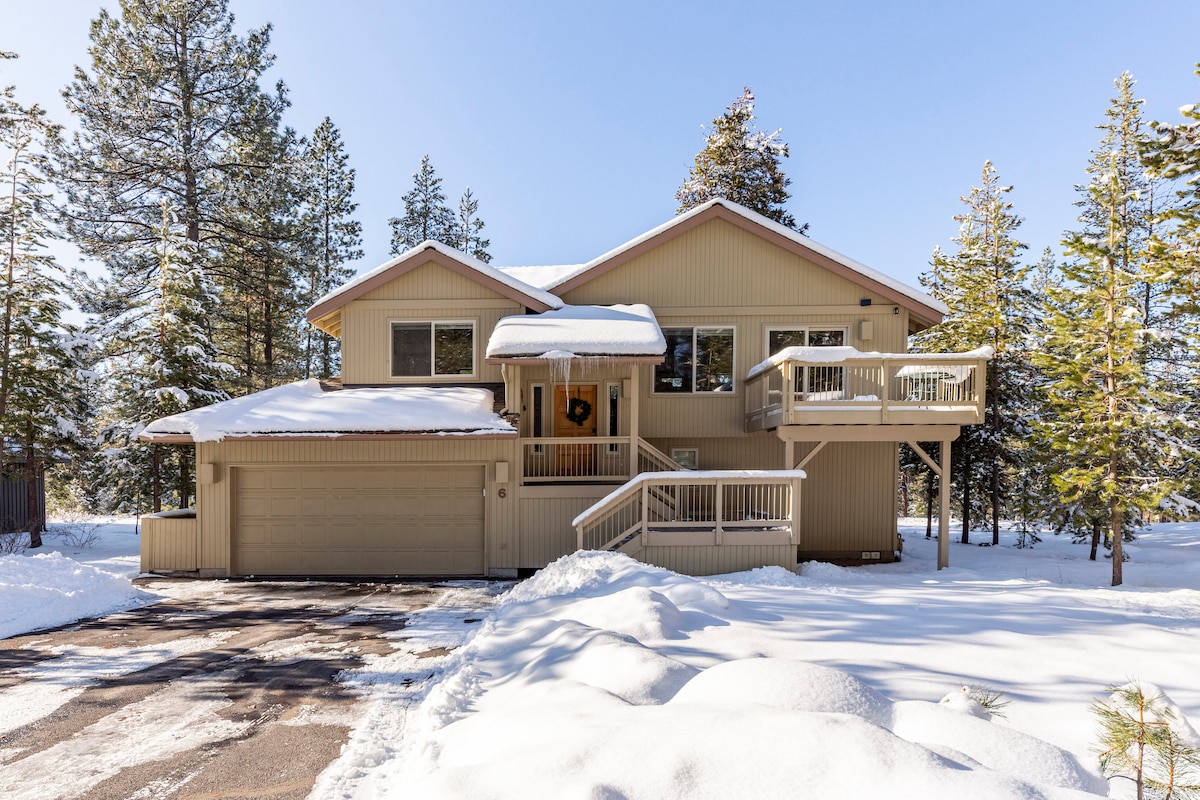 Stylish luxury family home w/8 SHARC passes (pool & lazy river), 6 Cruiser bikes, Hot Tub, 3 New Smart TV's for streaming, Ping Pong table, board games. Short walk to the river & Cardinal Landing Bridge. Fast 1GB WiFi, propane BBQ, Air Conditioning, cozy wood burning fireplace. Fully stocked kitchen for cooking, laundry inside. Quiet + Private w/large deck backing up to natural common space w/wildlife walking by. Bike everywhere w/easy access. Minutes to Mt Bachelor for skiing & sledding.