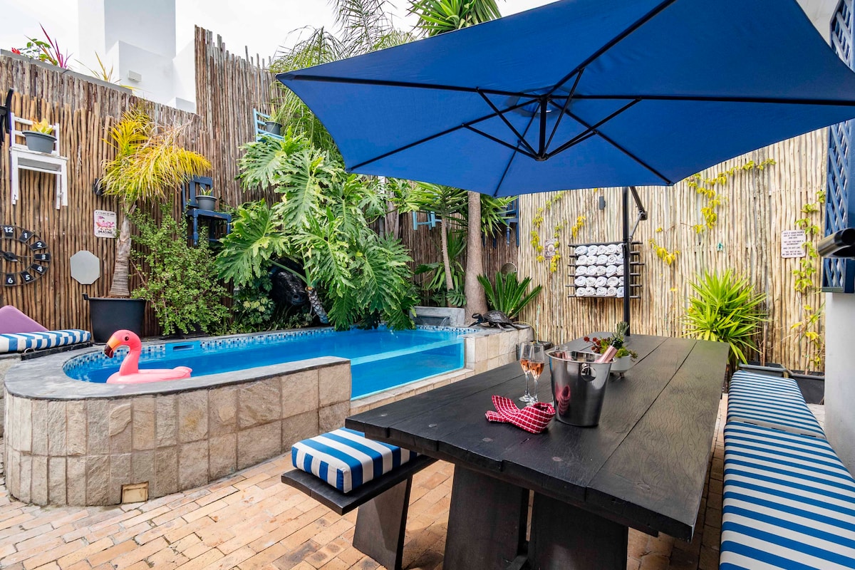 Experience luxury in our spacious pool villa, centrally located in Cape Town's stunning Atlantic Seaboard. Self check-in Private outdoor area with pool (incl moveable deck) High speed internet 300mbps Fully equipped modern kitchen Washer and dryer Secure garage parking King suite with ensuite & spa bath Large Smart TVs (incl Netflix) & aircons in each room Workstations Indoor fireplace Inverter (No Loadshedding) Built-in braai (BBQ) & covered dining area Gym equipment (incl treadmill)
