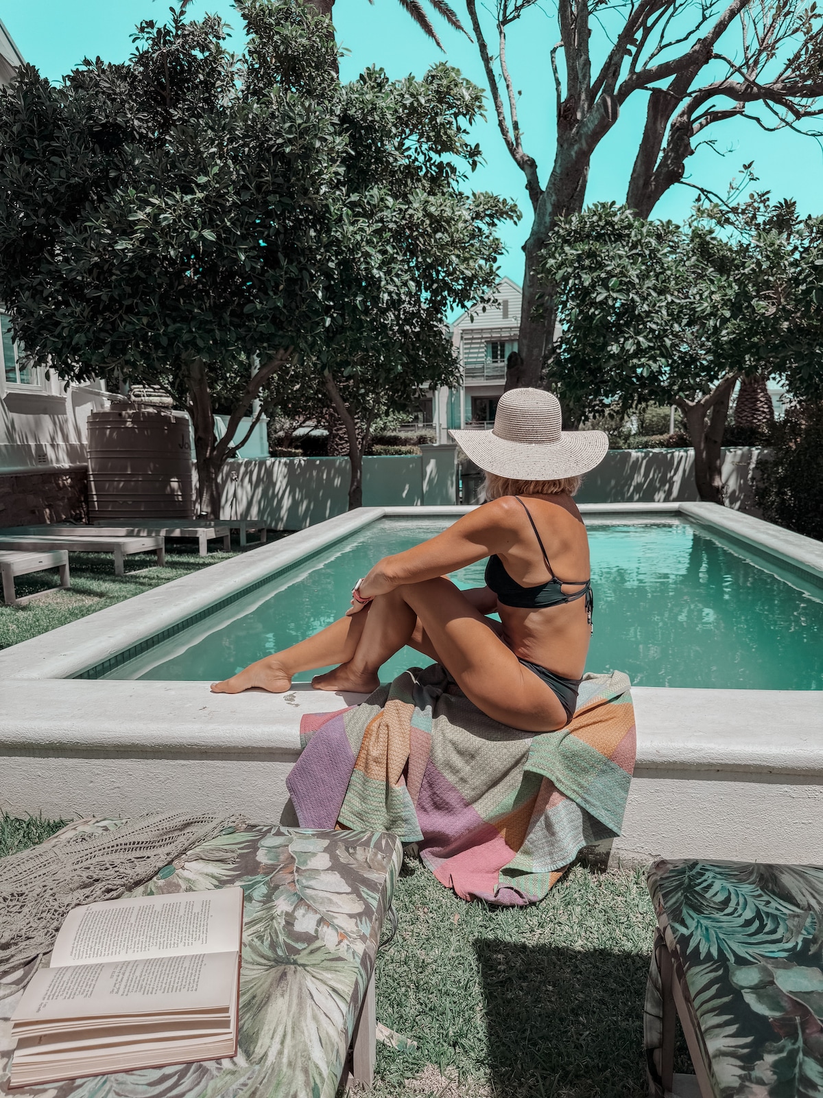 Lounge by the pool of this farm-style villa surrounded by lush green garden. The homestead offers a number of cosy nooks, including a peaceful backyard patio, a plush living room & bright sun room. The three bedroom, three bathroom layout makes spacious, relaxed easy living for 6. It's packed with amenities & a secure off street parking. The Fibre WiFi is super fast & reliable. An Inverter provides Electricity during LoadShedding for lights, Wifi, TV, Fridge and a Phone/Computer Charging Socket.