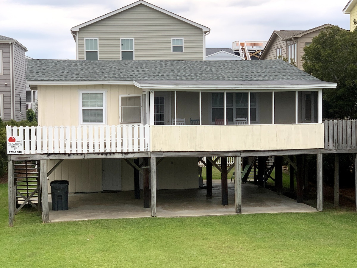 This beach house has everything you could want for your vacation. With 4 bedrooms and a loft, 2 bathrooms and an outdoor shower, and a screened in porch, everyone will be comfortable. It's a short walk to the beach with public access on our street, and one street over to the pier and island shops. Additionally, it is stocked with lots of games, bikes, beach gear and linens/towels, making your packing light. You'll have a great time making wonderful memories!
