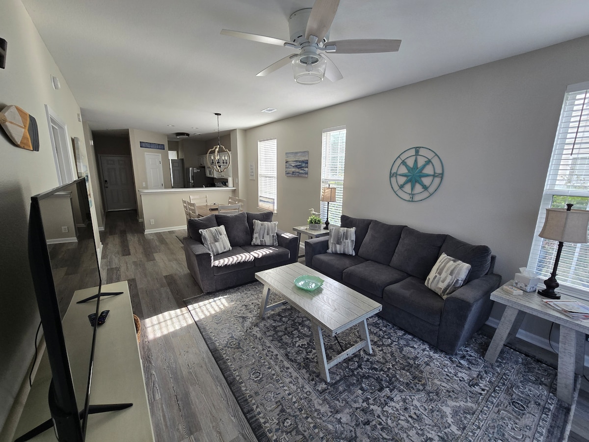 "Retro Vintage Palm Springs" vibe! Fun & Fabulous location! This stylish first-floor condo is located right on the golf course, just 5 minutes from the beach and 20 minutes from South Carolina. The condo is comfortable, chic, and fully stocked with everything you need. Whether you love cooking, reading, watching movies, or sipping coffee, we’ve got you covered!
